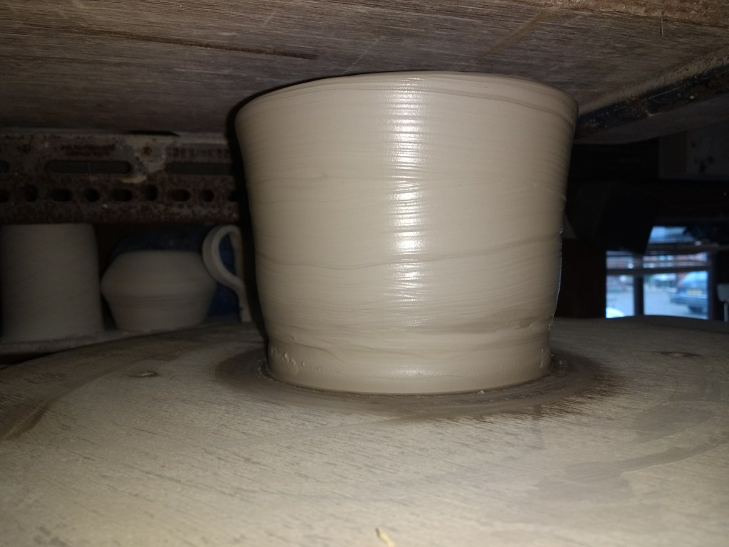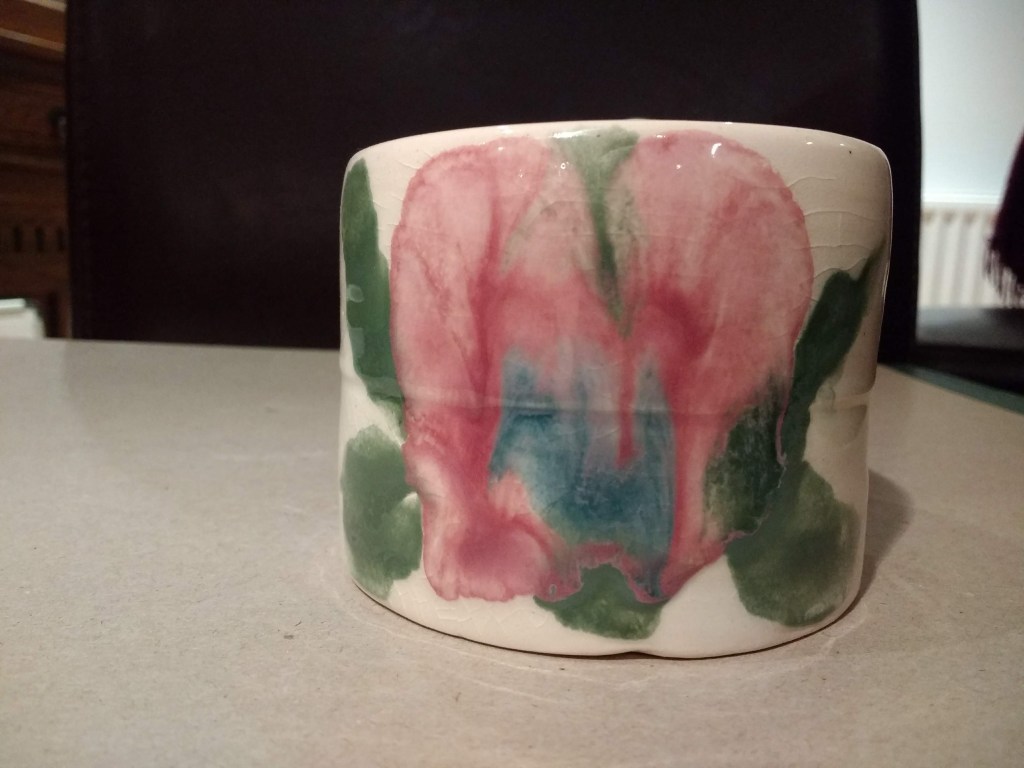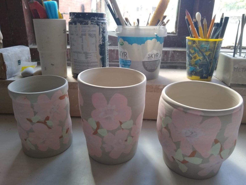 More pots Underglaze flower painting to green ware pots Dry thrown Green Ware – Jug, Mug and dipping dish Planter after throwing Planters after decorating with hand painted flowers Hand thrown painted Vases Hand thrown hand painted mug